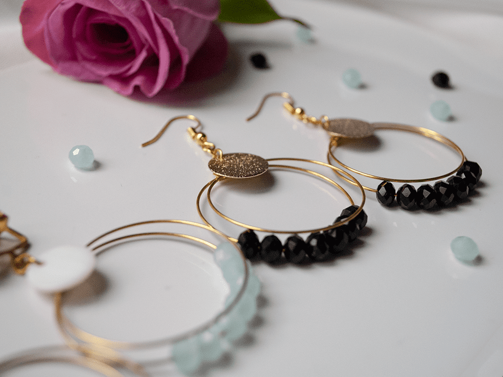 Composé de créoles dorées et de jolies perles en verres, ce modèle est également orné d’une nacre naturelle ou d’un sequin doré en fonction de la couleur.